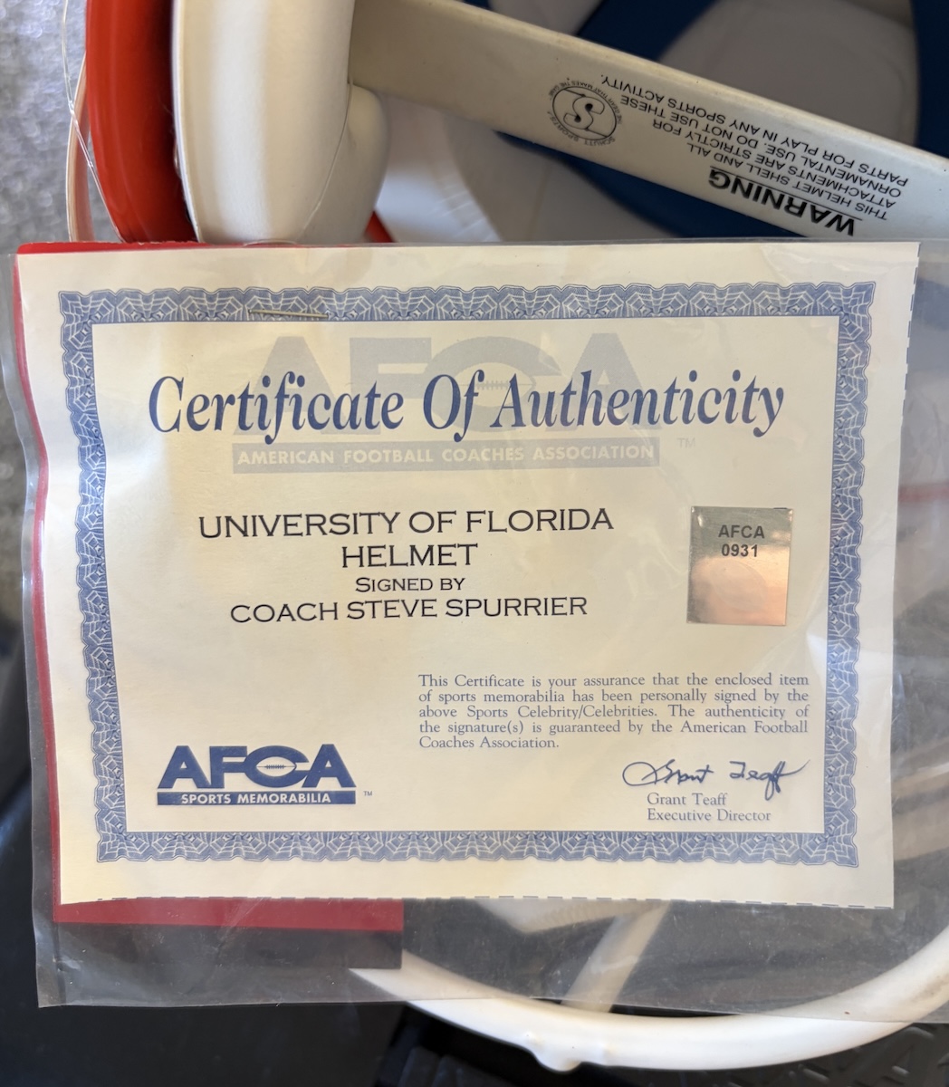 We are giving away a full-size Gators helmet signed by Coach Steve Spurrier, with a certificate of authenticity. Every dollar = 1 raffle entry! The drawing will be October 31, 2025 at 5pm ET!